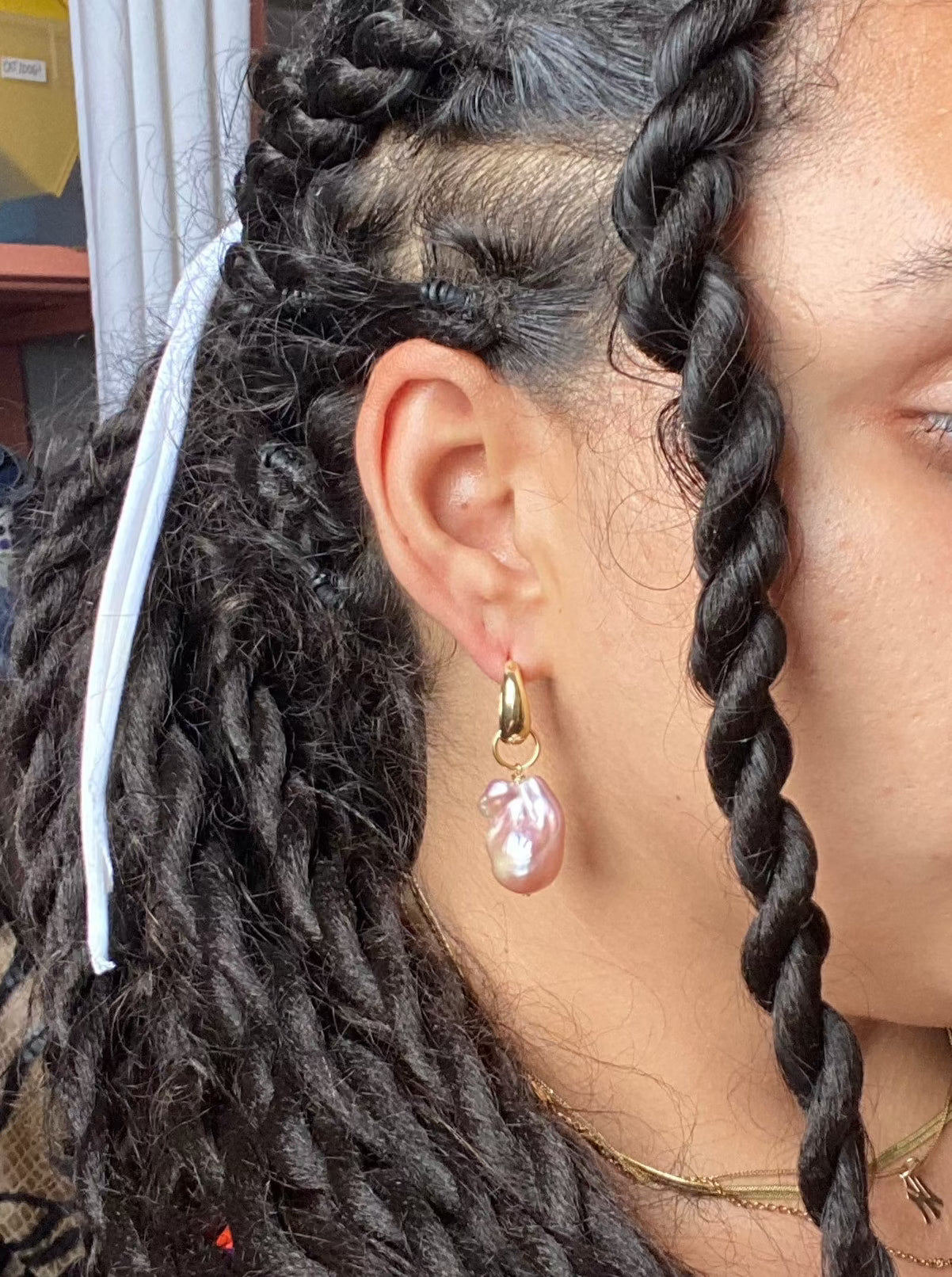 Genevieve of Eden's Harvest is a magical jeweler and writer based in NYC. This earring consists of a single, large grade AAA high luster baroque pearl in its natural mauve state. Due to it’s nature as a freshwater pearl, each one will be varied and unique. Please expect variation from the photo. gold-filled hardware and medium-sized huggie hoop accompanies the pearl.