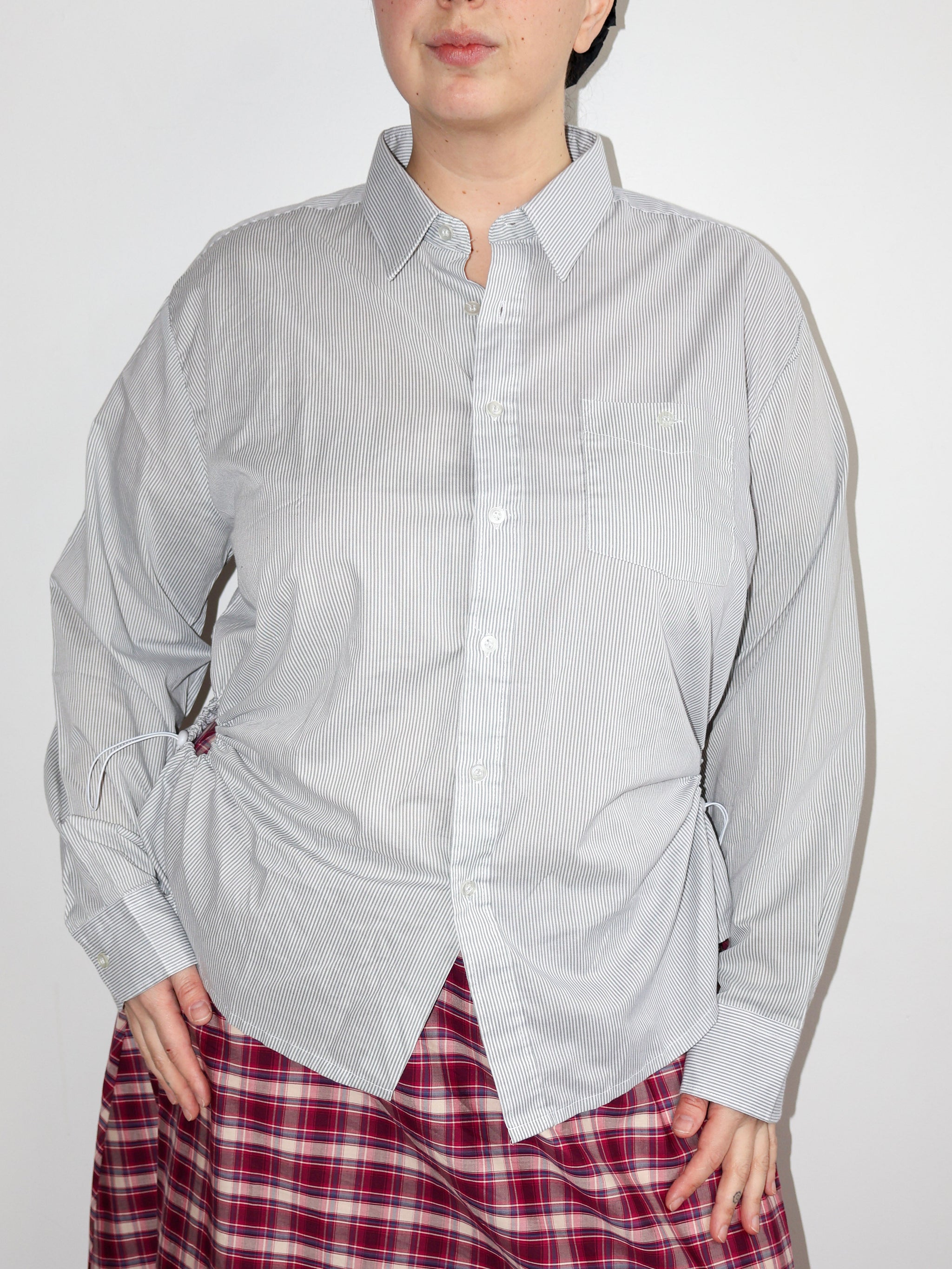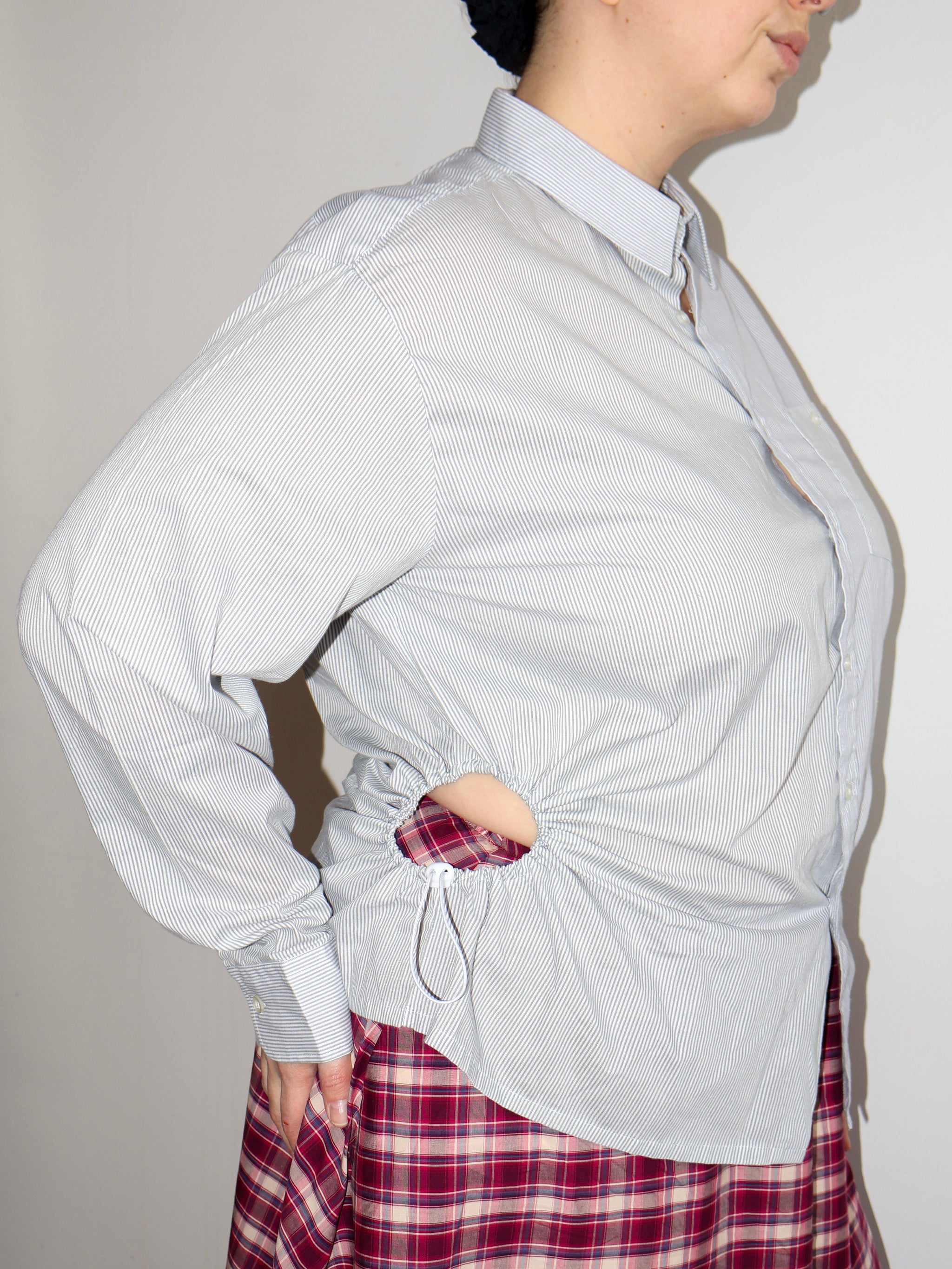 An elevated update to the classic button up. The Bungee Shirts by Vancouver-based Nena Hansen are reworked vintage button-ups with an adjustable bungee cord cut out. Pair these shirts with denim, a skirt, or even sweatpants - they seriously look good with everything! Wear it buttoned all the way up or undone.