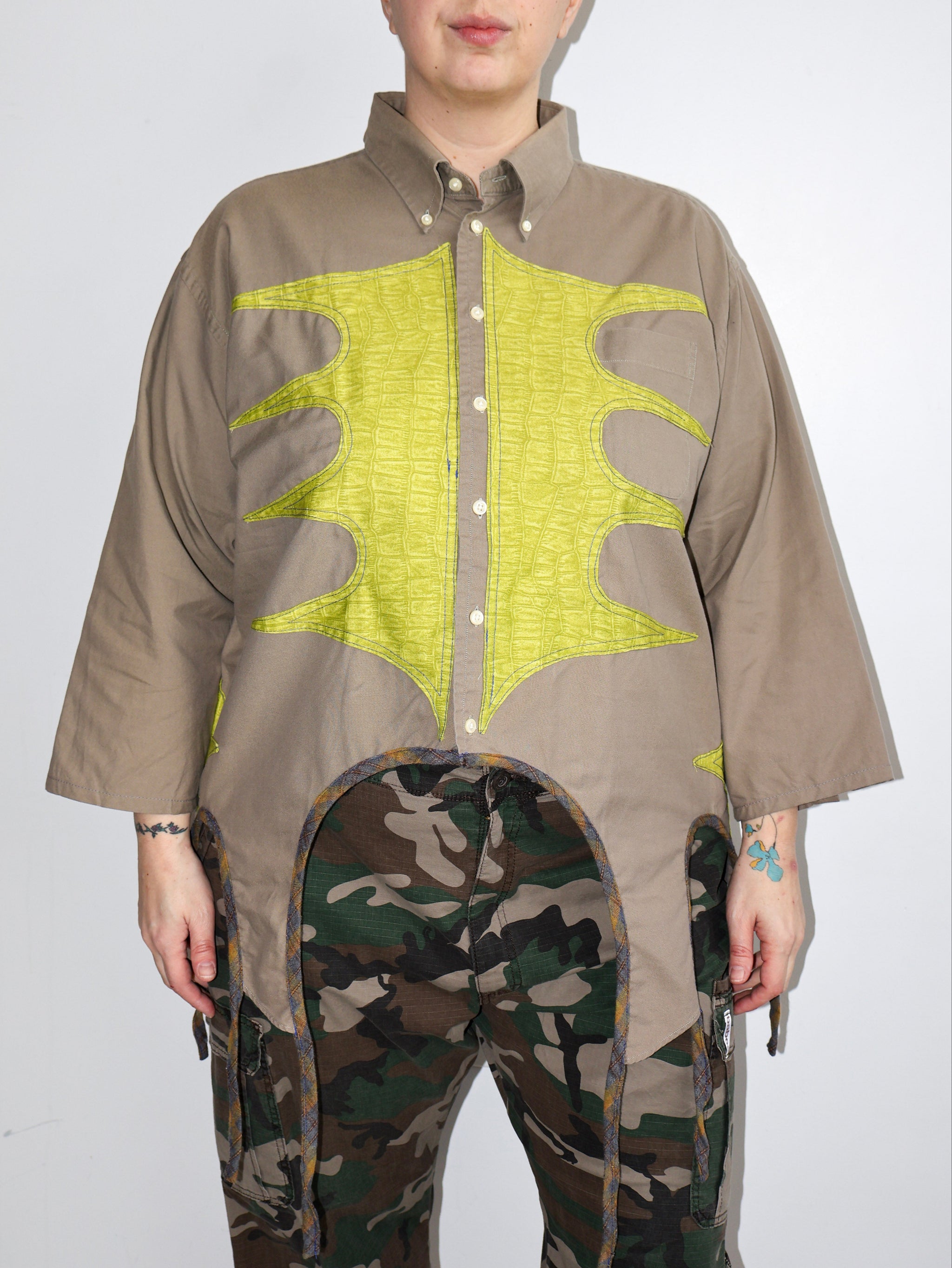 We sourced the button downs and sent them to Tiberi, all the way in Los Angeles, to rework. Each one is one-of-a-kind.
